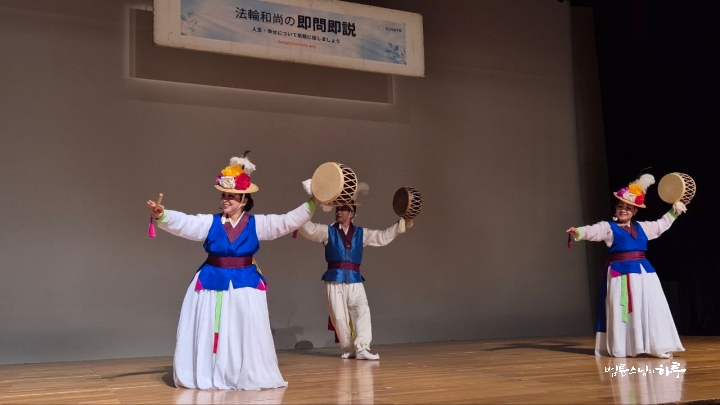 스님은 재능 기부로 공연을 해준 '한사랑 한국 무용 연구소' 단원들을 위해 감사의 마음을 전하고 무대 위에서 기념사진을 찍었습니다.