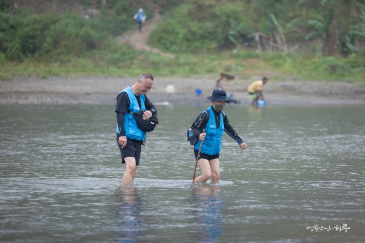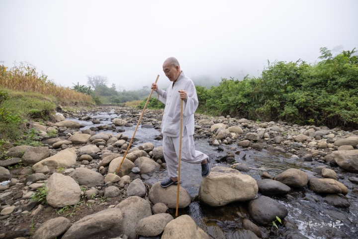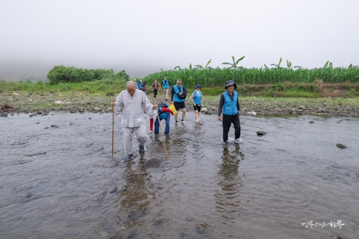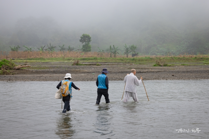 스님이 가장 앞장서서 성큼성큼 강을 건너며 깊이를 확인해 주었습니다.