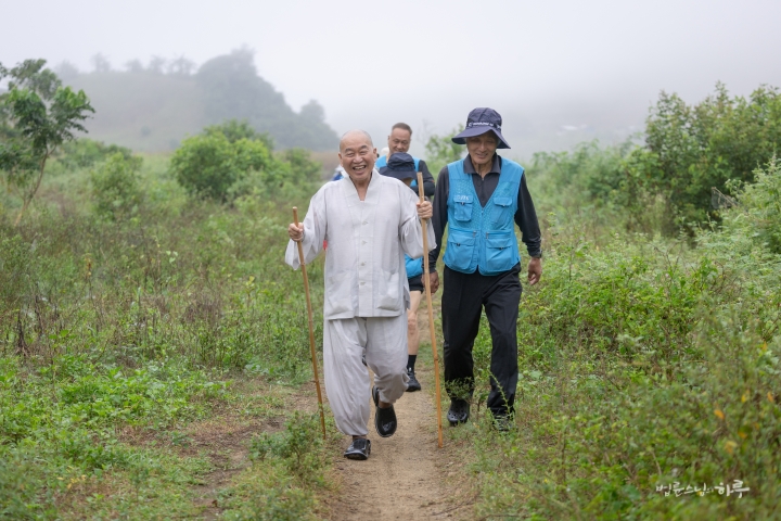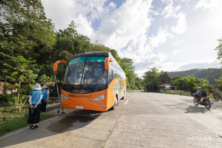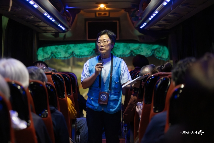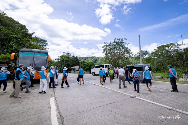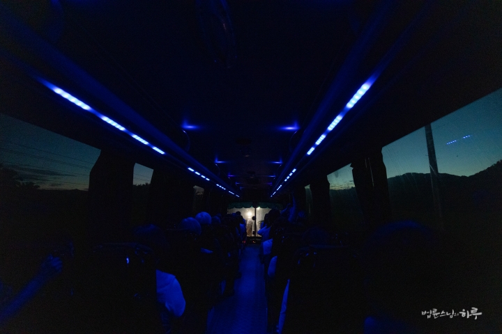 옛 추억을 떠올리며 이야기를 나누다 보니 드디어 포장도로가 나타났습니다. 모두가 버스로 갈아타자 향훈 법사님이 다음 일정을 공지했습니다.
