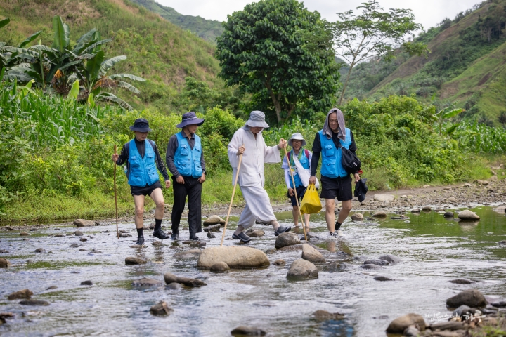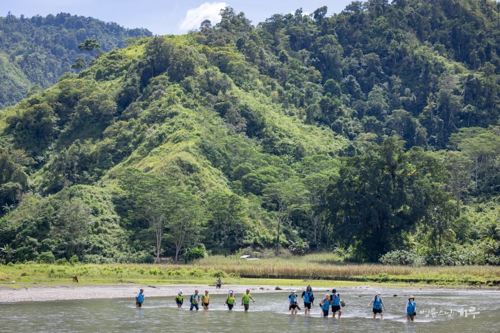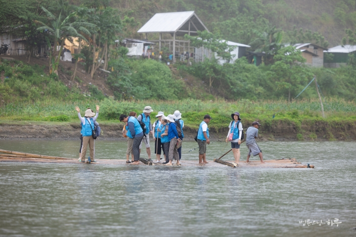 스님의 뒤를 따라 JTS 방문단도 뗏목을 타지 않고 강을 유유히 건넜습니다. 물살이 거세지면 옆 사람의 손을 잡으며 중심을 잡았습니다.