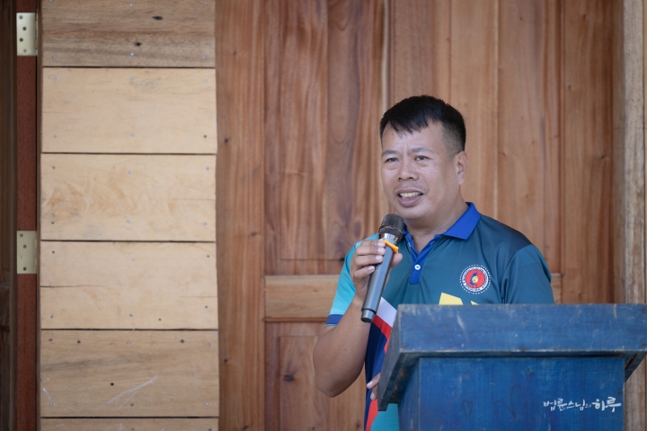 이어서 스님이 앞으로 나와 축사를 했습니다. 먼저 학교를 완공하기까지 수고한 분들에게 감사의 마음을 전한 후 마을 주민들과 학생들에게 몇 가지 당부도 전했습니다.