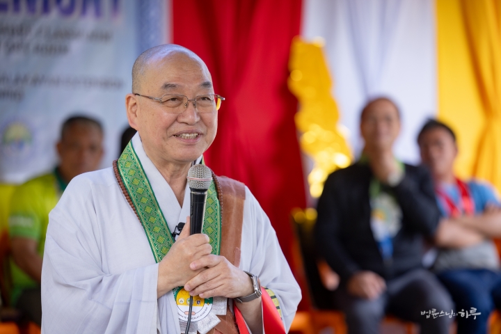 스님은 에드윈 님을 무대 위로 불러내어 꽃목걸이를 걸어 주며 특별히 감사의 마음을 전했습니다.