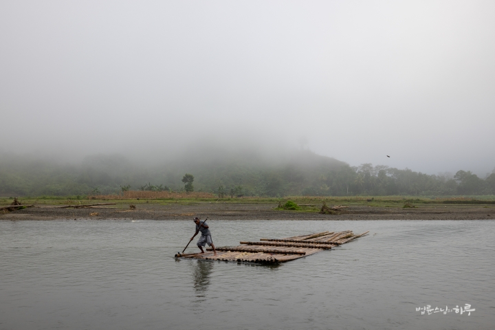 강에는 마을 주민들이 직접 만든 뗏목을 운행하고 있었습니다. 물살이 제법 거센 것 같아서 일부는 뗏목을 타고 강을 건너기로 했습니다.