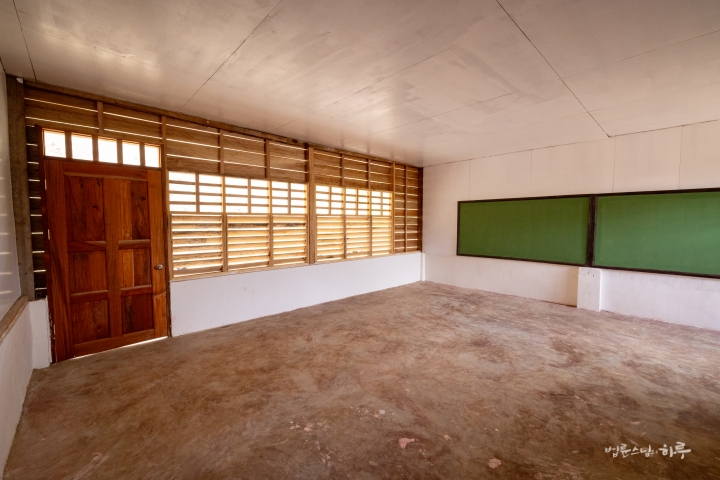 콘크리트로 평평한 바닥을 만든 다음 그 위에 나무로 교실을 정갈하게 지었습니다. 교실 옆에 화장실도 정갈하게 잘 지어져 있었습니다. 산골 오지 마을에는 교사들이 출퇴근을 할 수 없기 때문에 한쪽 편에 교사 숙소도 함께 지었습니다.
