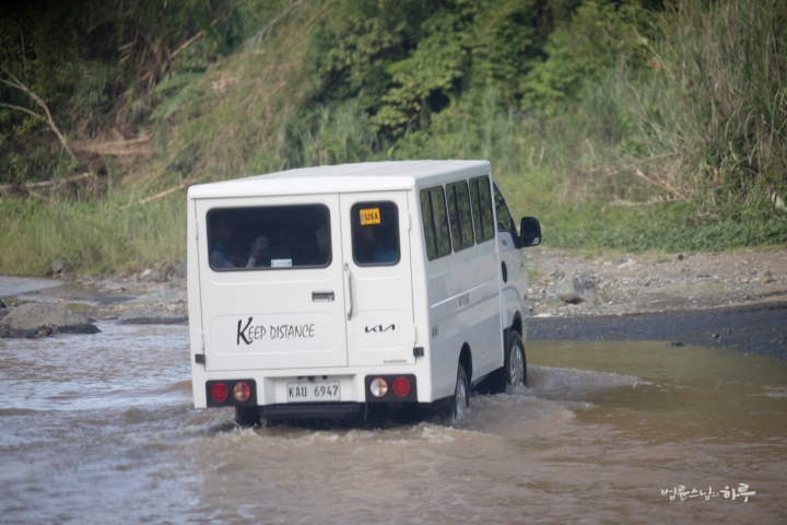 모두가 강을 건너자 오전 11시가 되었습니다. 다시 버스를 타고 다음 준공식 장소로 향했습니다. 포장된 도로를 1시간 30분 가량 달리자 비포장도로가 나타났습니다. 여기서부터는 버스가 갈 수 없는 길입니다.