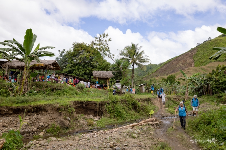 마지막 개울을 건너는데 멀리서 둥둥둥 북이 울리는 소리가 들려왔습니다. 드디어 빵아라이아얀 마을이 모습을 드러냈습니다.