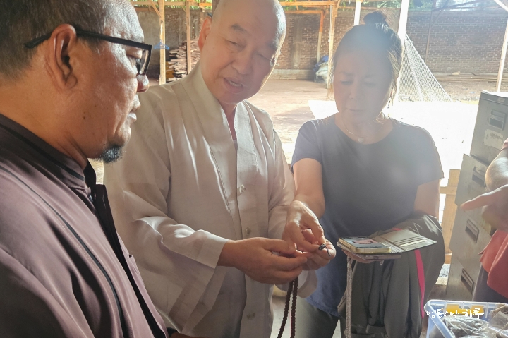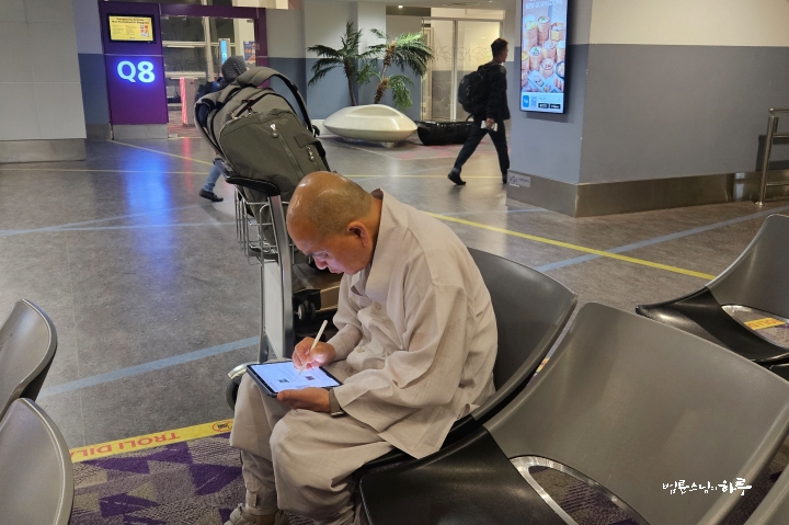 스님은 긴급구호 활동 준비로 밤을 꼬박 새운 후 새벽 6시에 공동체 법사단과 실무자 인사 배치안에 대해 온라인으로 회의를 했습니다. 회의를 마치고 7시에 아침식사를 한 후 숙소에서 잠깐 휴식을 취했습니다.