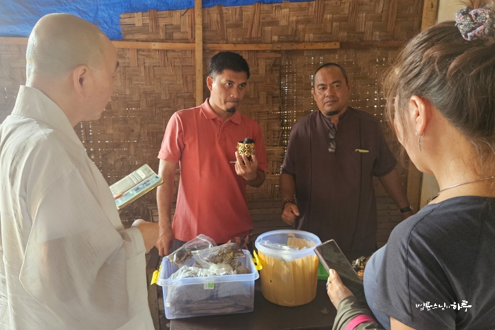 스님은 밤 12시에 숙소에 도착해 박지나 대표님과 함께 구호물품 시장조사 결과를 논의했습니다. 먼저 메단에 도착한 박 대표님은 여러 공장을 방문하며 어떤 구호물품을 구매할지 미리 조사를 했습니다. 장화, 바가지, 괭이, 삽, 망치 등 홍수 피해 주민들이 집 안을 정리하는 데 꼭 필요한 도구들을 비교적 저렴하게 구매할 수 있는 곳들을 찾아 그 결과를 공유했습니다. 밤늦게까지 이어진 회의를 마친 뒤 하루 일과를 마무리했습니다.