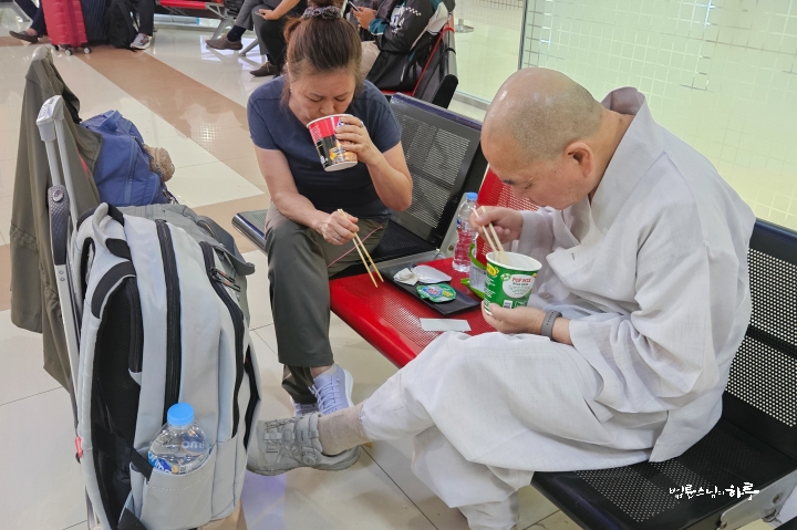 아미르 님과 인사를 나누고 공항으로 들어가 출국 수속을 밟았습니다. 박지나 대표님은 반다아체에서 메단으로 바로 가는 비행기를 타고, 스님은 표를 구하지 못해서 다시 말레이시아 쿠알라룸푸르를 경유해서 메단으로 가게 되었습니다. 탑승구 앞에서 컵라면으로 점심식사를 하고 비행기 출발 시간까지 기다렸습니다.