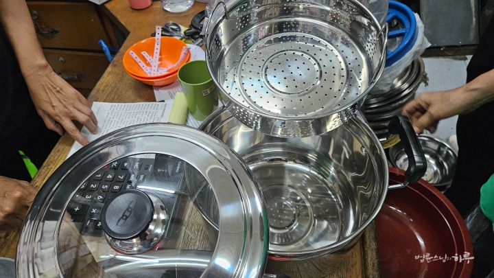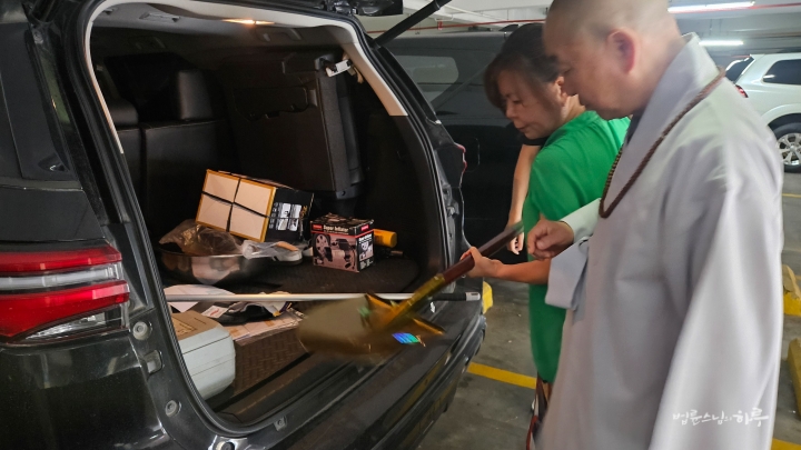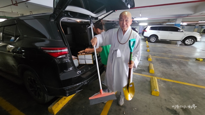 이어 낮 12시 30분에는, 어제 안드레 님의 공장에서 확보한 삽, 괭이, 장갑 등 청소용품의 품질 상태를 점검했습니다. 스님은 삽을 직접 들어보고 튼튼한지 확인했습니다.