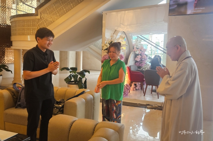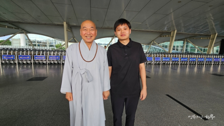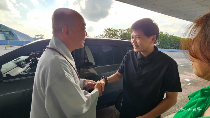 이로써 3박 4일간의 인도네시아 아체주 홍수 피해지역 답사 일정을 모두 마쳤습니다. 공항까지 배웅 나온 안드레 님에게 스님은 감사의 마음을 담아 단주를 선물했습니다.