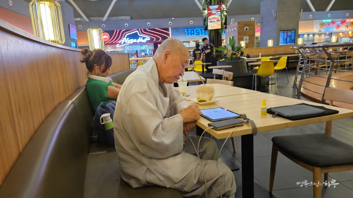 저녁 8시 50분, 중간 경유지인 쿠알라룸푸르 공항에 도착해 약 4시간을 대기했습니다. 기다리는 동안 간단히 저녁 식사를 했습니다. 스님이 웃으며 말했습니다.