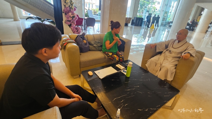 스님은 새벽 수행과 명상을 마친 뒤, 숙소에서 간단히 아침식사를 하고 오전 7시 40분부터 안드레 님과 함께 구호물품 시장조사를 위한 회의를 하며 하루를 시작했습니다.