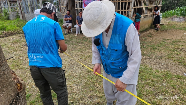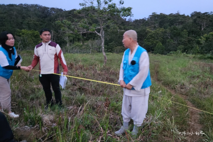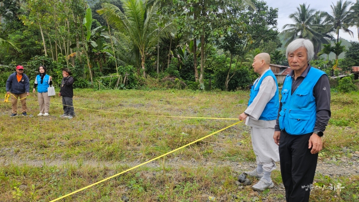 스님과 JTS 활동가들이 여러 번 줄자를 당기며 이리저리 재어보았습니다. 땅이 꾸불꾸불해서 건물 방향을 정하기가 쉽지 않았습니다. 측정 결과 36미터가 나왔습니다.