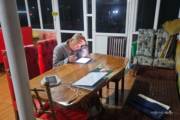 밤 8시가 넘어서 숙소에 도착했습니다. 방안의 인터넷 사정이 좋지 않아 스님은 공용 공간으로 나와 원고 교정 작업과 업무를 보았습니다.