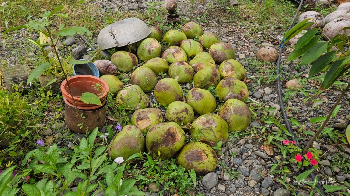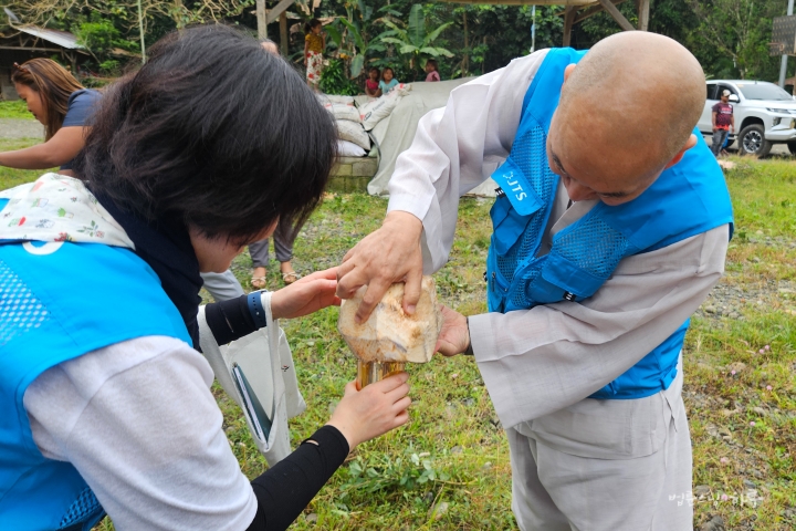 현장을 둘러보고 나자 마을 주민들이 직접 딴 코코넛을 내어주었습니다. 스님은 코코넛 물을 직접 잔에 따라주며 "이렇게 따라야 한 방울도 흘리지 않고 다 따를 수 있다" 라고 알려주었습니다.