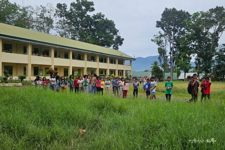 오전 9시 10분, 할라피딴(HALAPITAN) 중앙초등학교에 도착했습니다. 학교는 비를 피할 수 있도록 복도가 지붕으로 연결되어 있었고, 교실 앞으로는 넓은 잔디밭이 펼쳐져 있었습니다.
