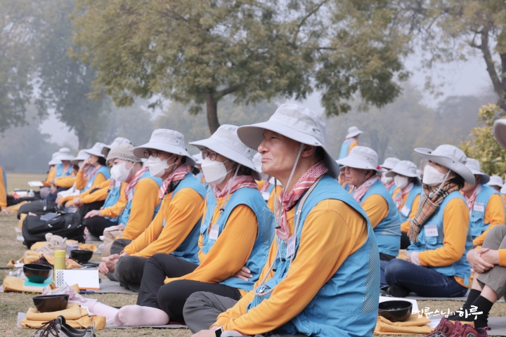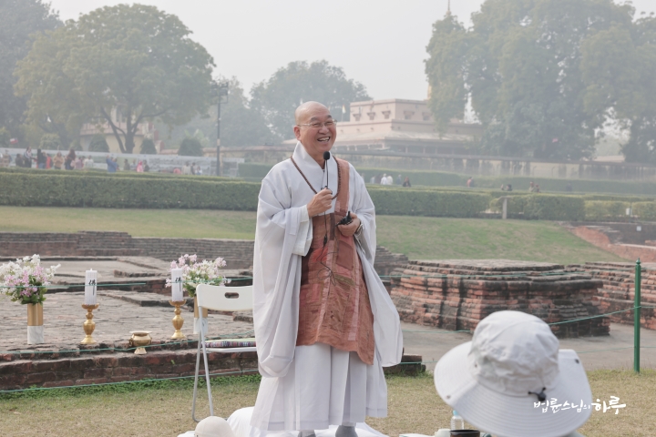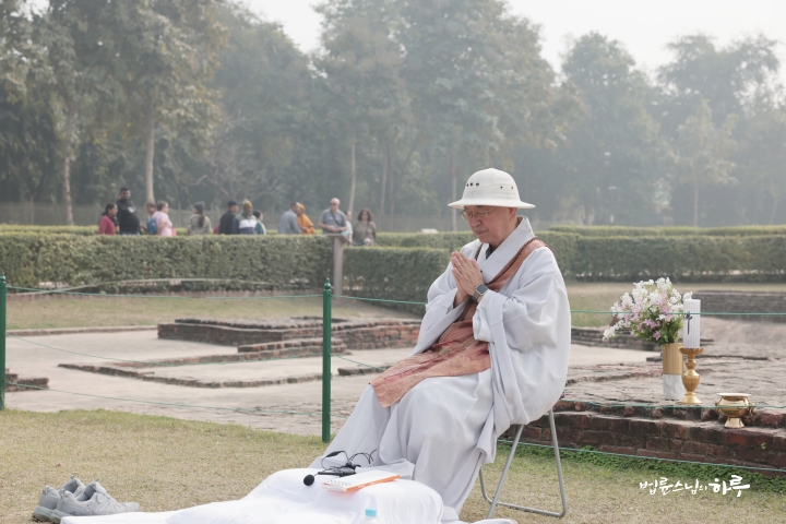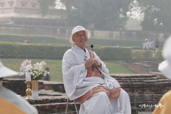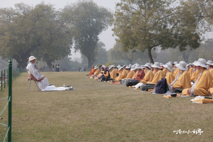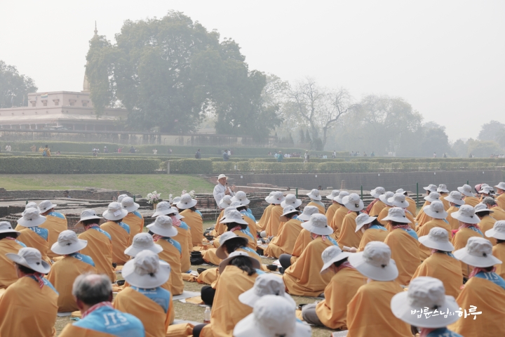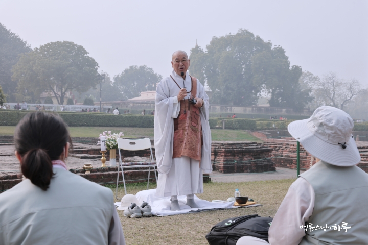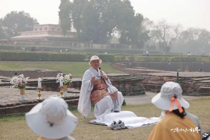 여러분도 이 법을 자각해서, 오래 살아도 좋고, 일찍 죽어도 좋고, 여기 있어도 좋고, 저기 있어도 좋고, 이 사람과 살아도 좋고, 안 살아도 좋은 그런 경지에 이르러야 합니다. 물론 쉽지는 않습니다. 성지순례를 왔지만 끝날 때까지 여기만 있어도 괜찮고, 이곳저곳 다녀도 괜찮아야 합니다. 많이 구경해도 좋고, 가만히 있어 편안해도 좋아야 합니다. 이래도 좋고 저래도 좋은 경지를 여러분이 증득했으면 좋겠습니다. 그래야 먹고, 입고, 자는 것으로부터 자유로워질 수 있습니다. ‘나는 안 먹을래.’ 하는 단식은 결심과 각오의 문제입니다. 그러나 먹는 것으로부터 자유로워지려면, 먹고 안 먹고 모두로부터 자유로워져야 합니다. 안 먹는 것이 곧 자유는 아닙니다. 이런 무유정법이 바로 이곳에서 처음 설해졌습니다.”
