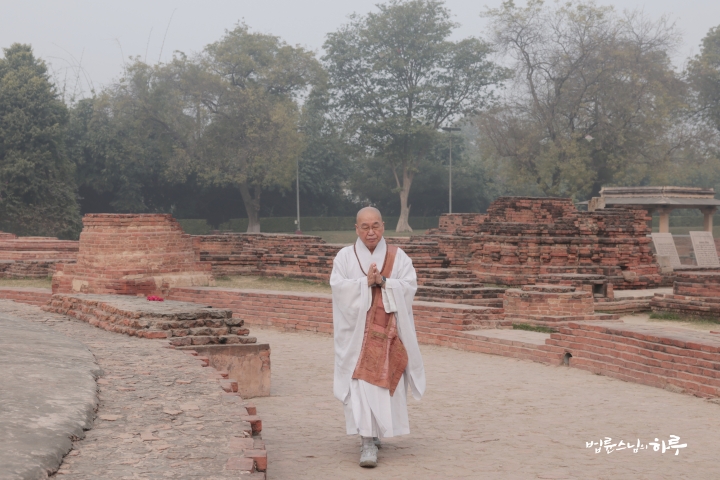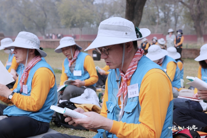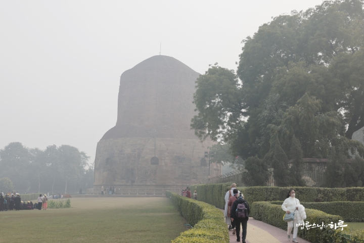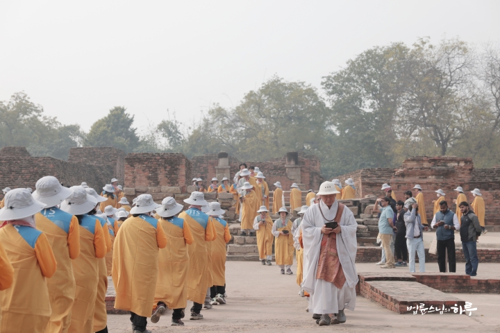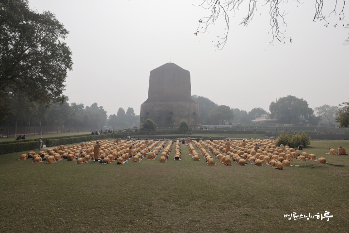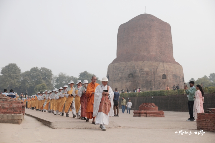 “지금 우리는 부처님께서 처음으로 법의 수레바퀴를 굴리신 곳, 바라나시 근교 사르나트에서 순례의 첫발을 내딛고 있습니다. 현재 우리가 남동쪽을 바라보고 있는데, 여러분이 보고 계신 방향에서 오른쪽으로 약 1킬로미터쯤 가면 영불탑(迎佛塔)이 있습니다. 오비구(五比丘), 즉 다섯 비구가 부처님을 맞이한 곳이라 해서 그렇게 불리게 되었습니다. 그런데 실제로는, 환영하지 않았습니다.