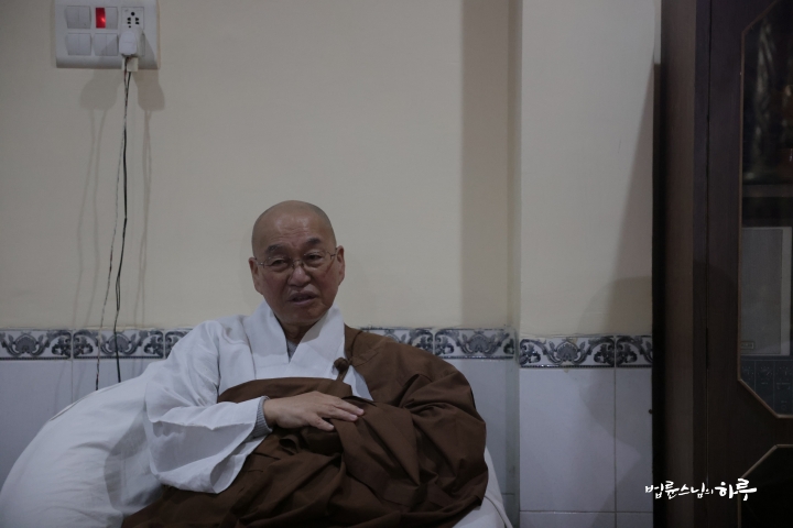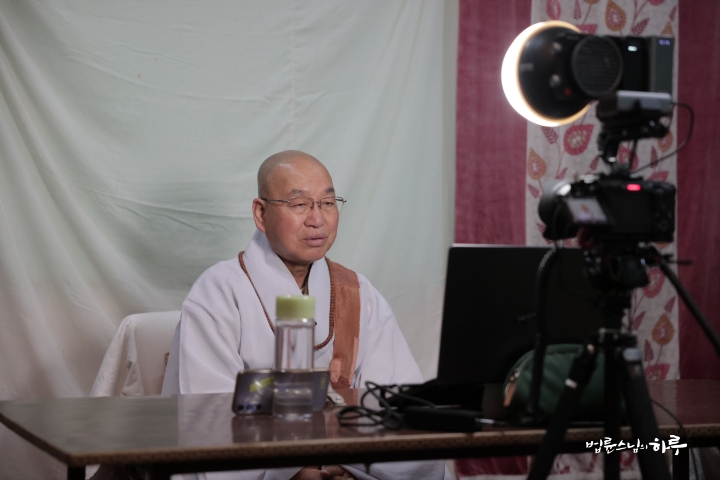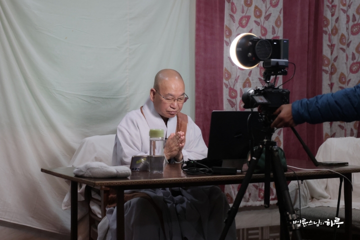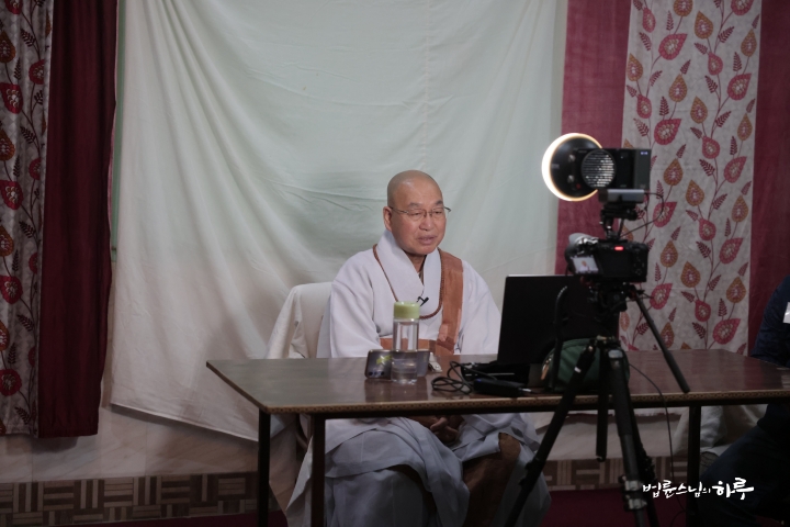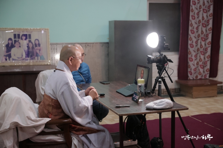 방송 시간이 다가와 대화를 마무리하고 저녁 6시부터는 성도재일 전야법회 생방송을 하기 위해 온라인에 접속했습니다. 한국 시각은 밤 9시 30분이었습니다. 영상팀이 숙소에서 방송할 수 있도록 미리 준비를 해놓았습니다. 죽비 소리에 이어서 스님이 법문을 시작했습니다.