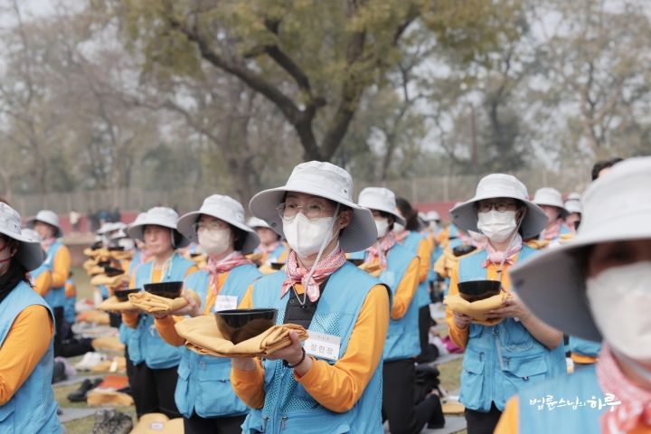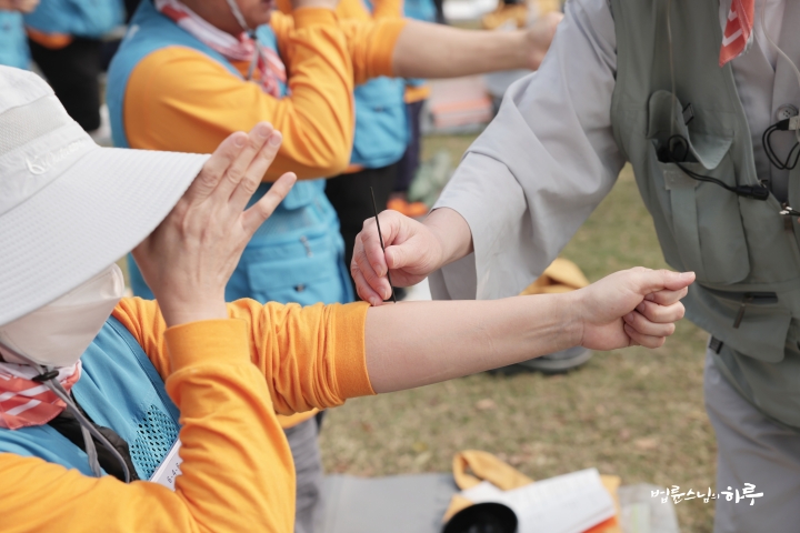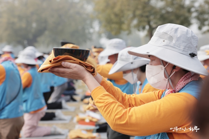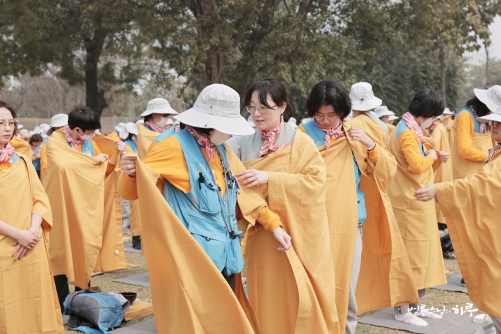 "지금 수여하는 가사와 발우는 13일 후 상카시아에서 반납합니다. 여러분들은 계를 받았으니 지금부터 성지순례 기간 동안만큼은 부처님처럼 살아보겠습니다. 지금부터 가사와 발우를 수여하겠습니다. 제가 여러분에게 '가사와 발우를 드립니다' 하고 이야기하면 '잘 받았습니다' 하고 가사와 발우를 이마 위로 살짝 들어 올립니다. 출가수행 대중들에게 가사와 발우를 드립니다."
