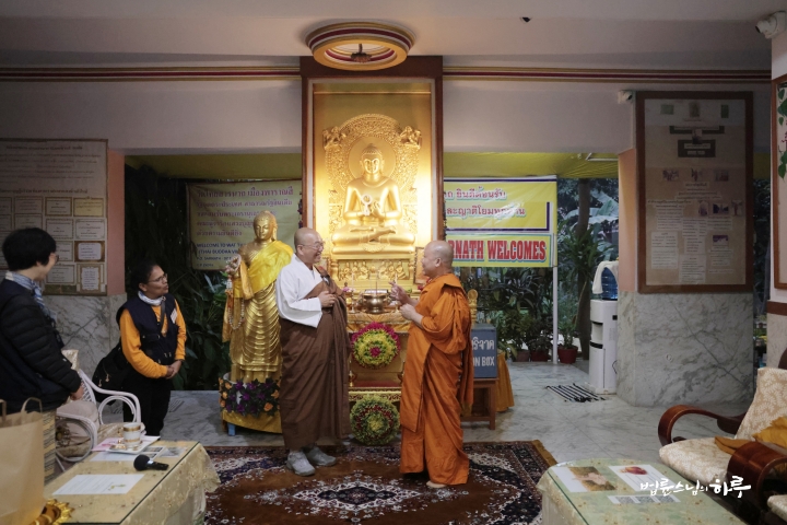 사르나트에 있는 태국 절은 코로나 이후 4년째 정토 성지순례단에게 숙소를 제공하고 있습니다. 올해도 태국 절 주지 스님은 스님을 반기며 언제든 머물 수 있다고 했습니다. 덕분에 대중은 편안하게 지낼 수 있었습니다. 스님은 감사의 뜻으로 선물과 보시금을 전했고, 주지 스님은 초전법륜상과 아쇼카 석주를 선물로 주셨습니다.