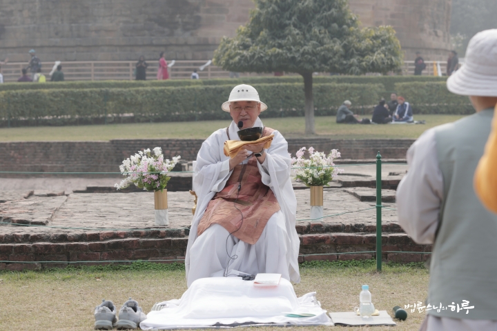 “이제 성지순례를 출발하기 위한 준비는 모두 끝났습니다. 한 사람의 수행자로서, 부처님께서 처음으로 초전 법륜을 설하신 이곳에 예불과 공양을 올렸습니다.