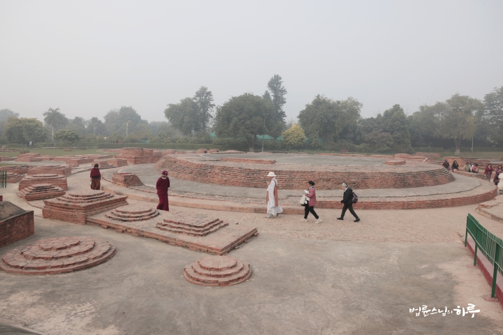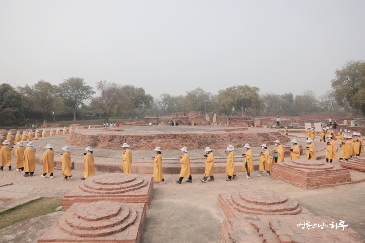 스님은 야사 비구의 출가와 그의 가족·친구들까지 깨달음을 얻어 61명의 아라한이 탄생한 이야기, 그리고 이곳에서 '전법의 길을 떠나라'는 역사적 선언이 있었다는 설명까지 하고 성지 설명을 마쳤습니다. 이어서 대중은 사르나트와 관련된 경전을 읽고 명상을 했습니다.