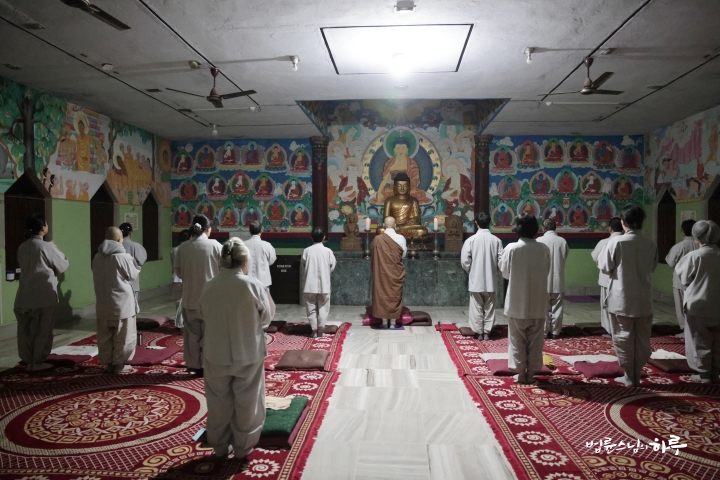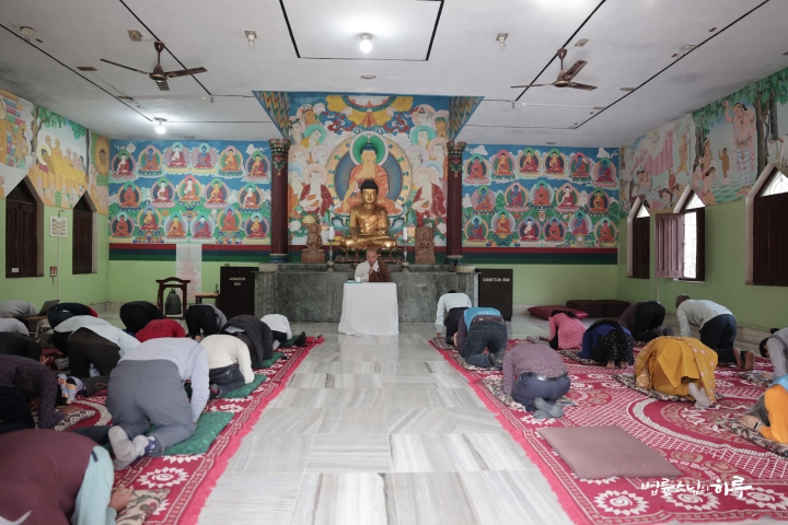 9시 30분에는 인도인 스태프들이 법당에서 스님에게 인사를 드리기 위해 모여서 기다리고 있었습니다. 인도인 스태프들은 스님에게 삼배를 올리며 세배 겸 배웅 인사를 드렸습니다.