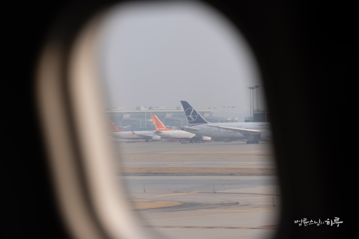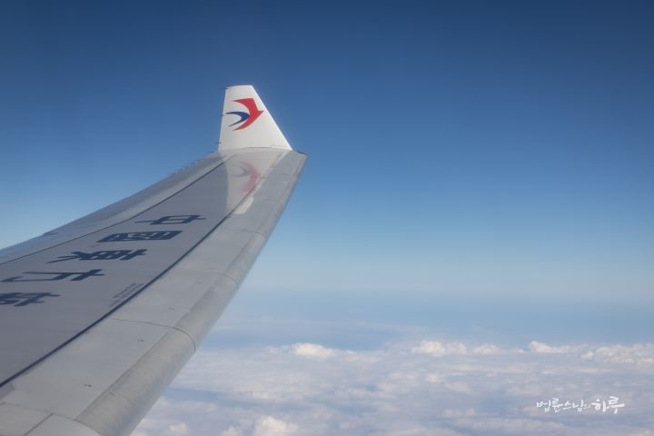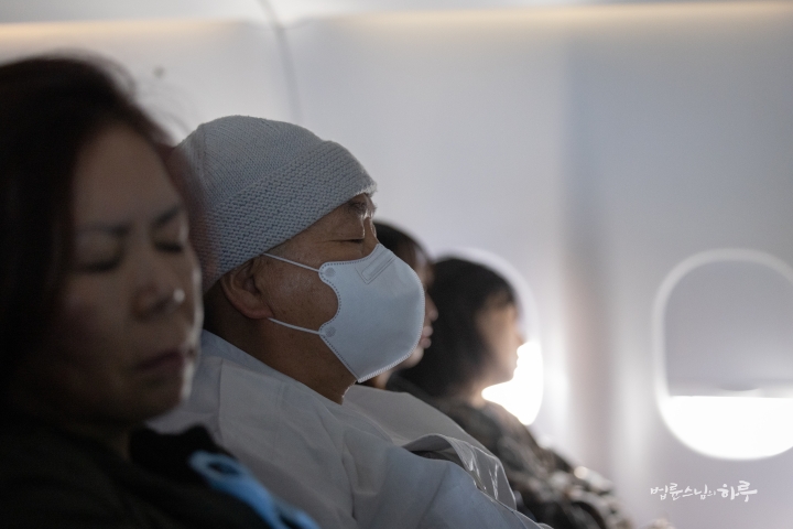 안내 방송이 나오고 다시 비행기에 탑승했습니다. 오후 1시 55분에 상하이 푸둥 공항을 출발한 비행기는 약 7시간 동안 하늘을 날았습니다. 비행기 안에서 스님은 휴식을 취했습니다.