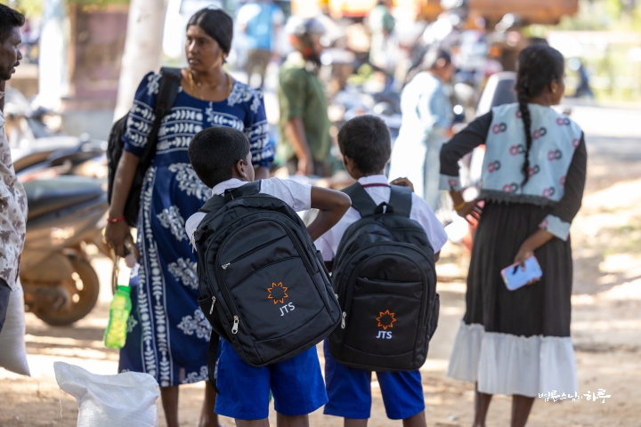 두 손으로 가방을 받아 든 아이들은 눈을 반짝이며 기뻐했습니다.