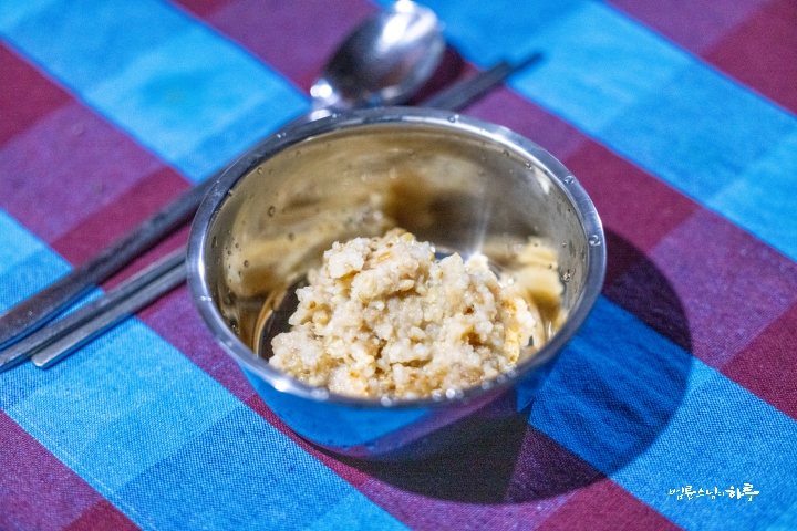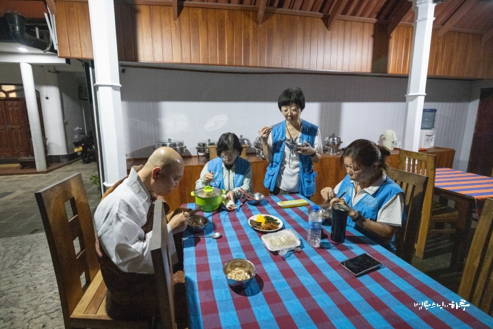 스님은 새벽 수행과 명상을 마친 후 오전 5시 30분에 숙소 식당에서 누룽지로 아침 식사를 했습니다.