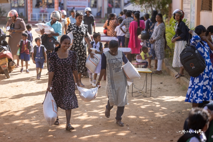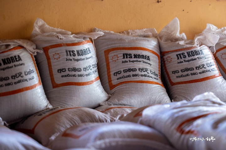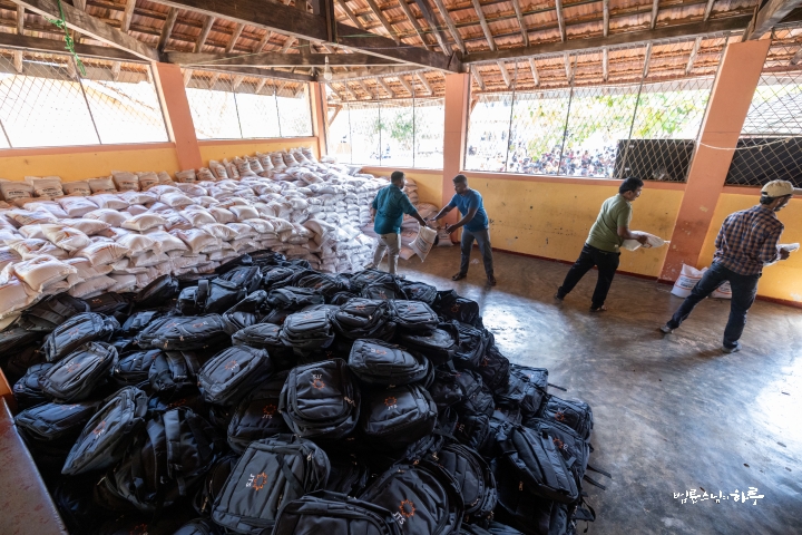 이어서 창고 앞으로 자리를 옮겨 본격적인 배분이 시작되었습니다. 테랑칸다와 만쿨람 일대 22개 학교의 저소득층 가구 1,000세대가 대상이었습니다. 아이들에게는 가방과 학용품을, 각 가정에는 쌀 10kg 두 포대씩 20kg을 전달했습니다. 공책, 연필, 스케치북, 물병 같은 학용품은 미리 가방 안에 넣어 두었습니다. 스리랑카 JTS 현지 봉사자들은 이틀 전부터 현장에 나와 물품을 하나하나 준비해 두었습니다.