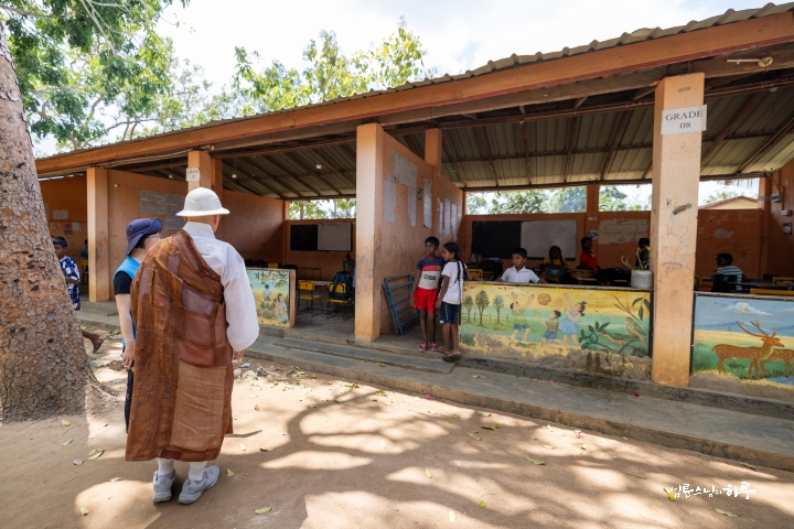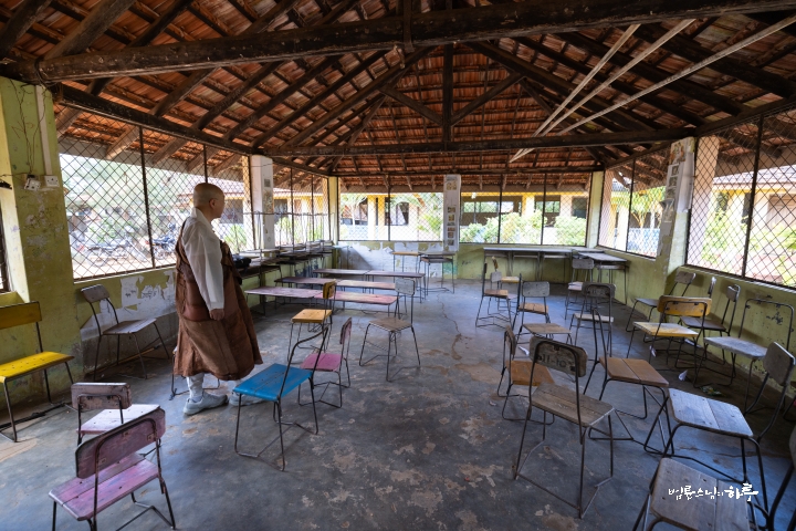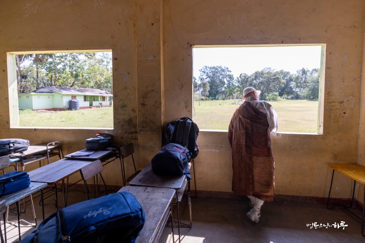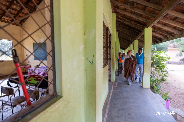 학교 측은 창문과 철망, 전기선 복구를 요청했습니다. 함께 학교를 돌아보며 훼손된 전기선 정비, 창문 수리, 화장실 보수 같은 항목을 하나씩 짚어 보았습니다. 스님은 낡은 것과 당장 위험한 것을 구분해서 봐야 한다고 말했습니다.