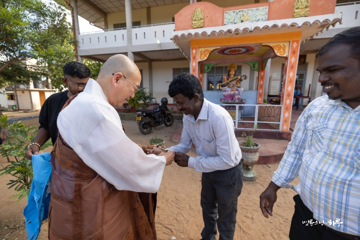 오늘까지 봉사를 하고 집으로 돌아가는 현지인 활동가들에게는 스님이 단주를 선물했습니다.