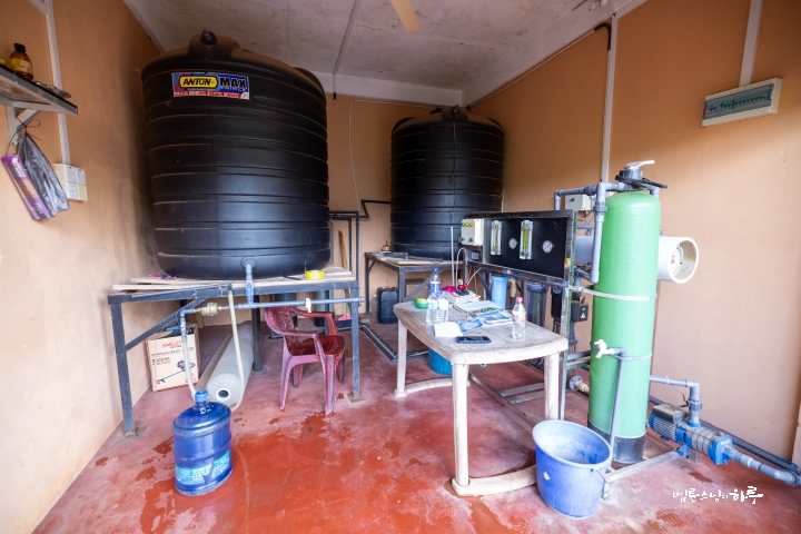 오전 10시 40분, 물을 공급하는 마을 정수 시설에 도착했습니다. 이 시설은 2021년에 설치되었고, 15일마다 필터를 교체한다고 했습니다.