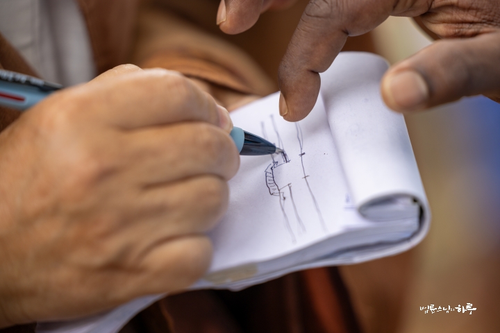 스님은 교문 앞으로 가서 빗물이 흘러드는 방향과 수로의 높낮이를 직접 살폈습니다. 학교 측에서는 교문 앞 전체를 콘크리트 수로로 만들어 달라고 요청했습니다. 스님은 더 적은 비용으로도 실질적인 효과를 낼 수 있는 방법을 제안했습니다.