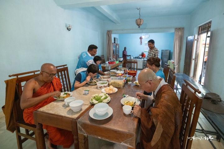 이른 아침부터 숙소 안이 분주했습니다. 숙소에 간단한 조리가 가능한 주방이 있어서 JTS 활동가들이 전날 시장에서 사 온 채소로 정성껏 아침상을 차렸습니다. 스님은 새벽 수행을 마친 후 오전 6시 10분에 활동가들과 함께 아침 식사를 했습니다.