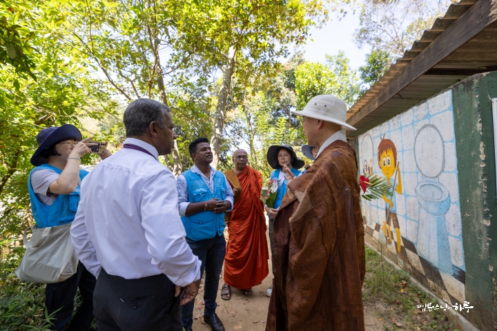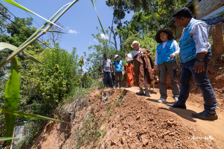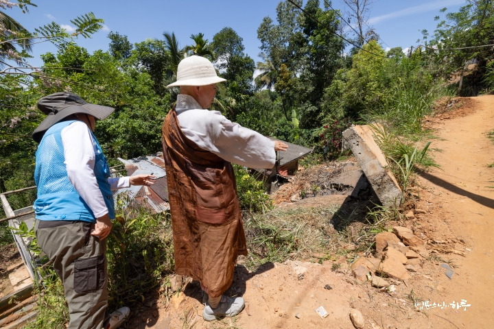 정상적으로 공사를 하려면 큰 공사가 되므로 주민들은 임시로라도 툭툭이 다닐 수 있게 해달라고 요청했습니다. 스님은 현장을 찬찬히 살핀 뒤 주민들이 할 수 있는 방법을 구체적으로 짚었습니다.