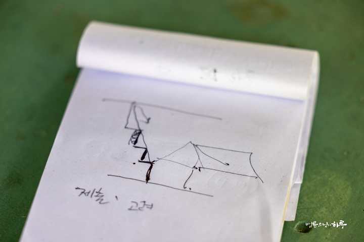 스님은 무너진 사면도 다시 살폈습니다. 흙이 흘러내리는 경사를 계단식으로 잘라 축대를 쌓아 올리면, 이 부분은 학부모들의 노동으로도 어느 정도 손볼 수 있을 것 같았습니다. 다만 이 역시 학교와 학부모들이 실제로 나설 수 있는지 먼저 확인하는 것이 중요했습니다. 스님은 직접 종이에 그림을 그려가며 무너진 사면을 복구할 방법을 제안했습니다.