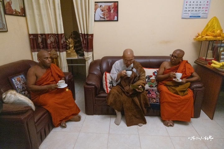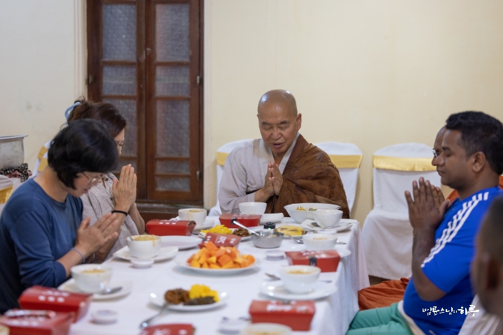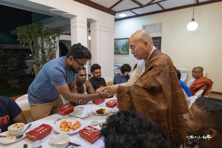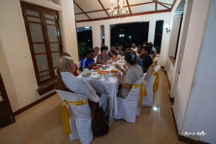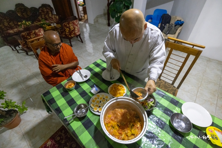 오후에는 정비하는 시간을 가진 후 저녁 8시에 스리랑카JTS 활동가들과 함께 다시 한자리에 모여 식사를 했습니다. 한국인 활동가들은 한국에서 가져온 라면을 끓였습니다. 스리랑카 활동가에게 먹고 싶은 음식을 사 오라고 하자 KFC 도시락을 사 왔습니다. 식사를 시작하며 스님은 먼저 고마운 마음을 전했습니다.