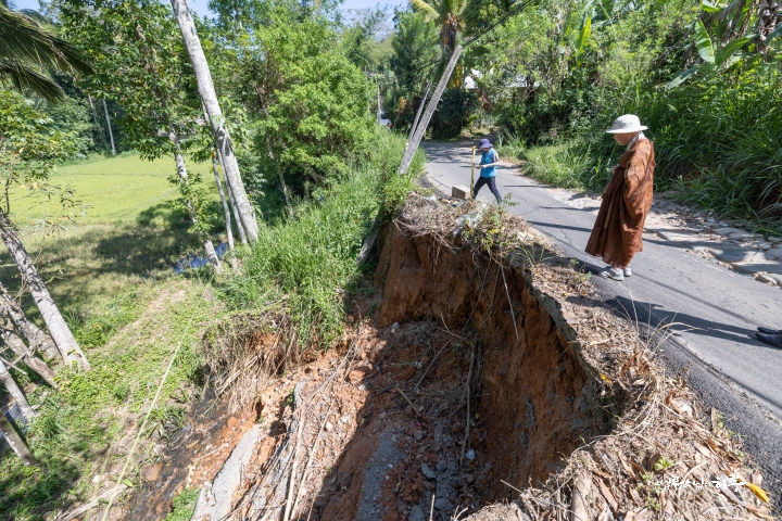 9시 50분에 감폴라에 도착해 사이클론으로 무너진 도로부터 가보았습니다. 스님은 내려서 짧게 현장을 살피며 말했습니다.