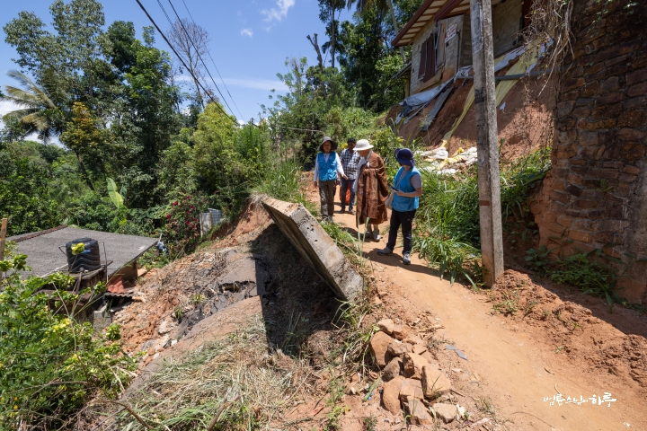집 뒤편에서 흘러내린 흙과 콘크리트 덩어리가 길을 막고 있었고, 이 길을 이용하는 가구만 80가구에 달했습니다. 사람은 간신히 다닐 수 있었지만, 툭툭은 지나갈 수 없었고, 아픈 사람이 생겨도 멀리 돌아가야 하는 형편이었습니다.