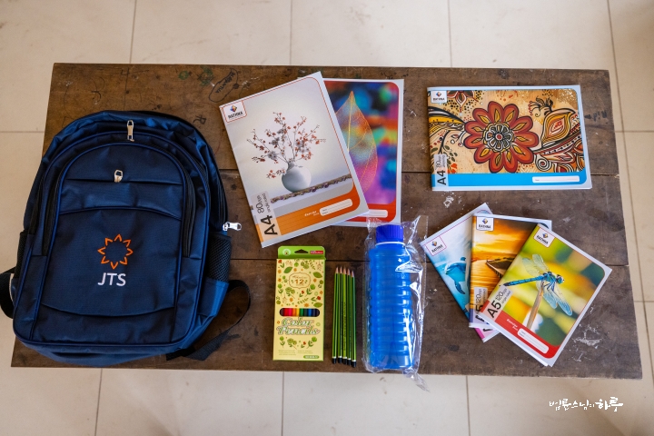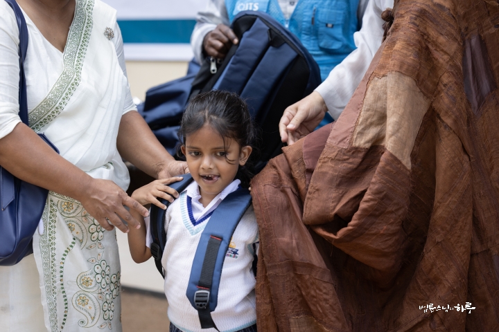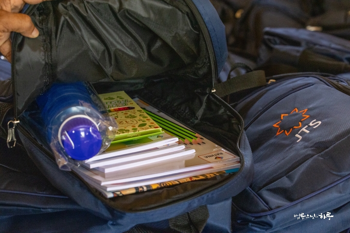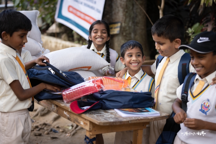 이어서 담마난다 스님이 주민들을 격려하는 인사말을 한 후, 이윽고 기다리던 주민들이 차례로 앞으로 나섰습니다. 먼저 스님이 아이들에게 책가방을 나눠주었습니다. 아이들의 책가방 속에는 학용품이 가득 들어 있었습니다.