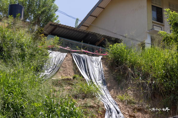 학교 뒤편 언덕에서는 산사태가 나 있었고, 10미터 가까이 되는 축대가 무너져 내려 학교 건물을 위협하고 있었습니다.