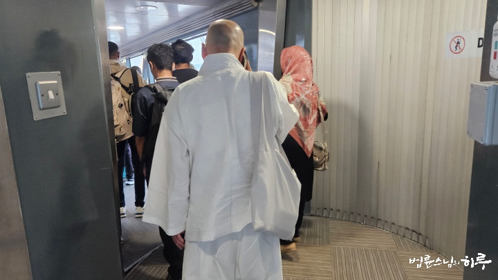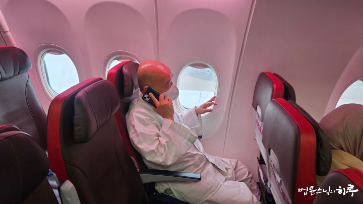 스님은 비행기 탑승 시간에 맞춰 탑승 후, 비행기가 뜨기 전에 전화로 간단히 업무 처리를 했습니다. 6시간 20분 비행 끝에 현지 시각 오후 1시 30분에 말레이시아의 쿠알라룸푸르 국제 공항(Kuala Lumpur International Airport)에 도착했습니다.
