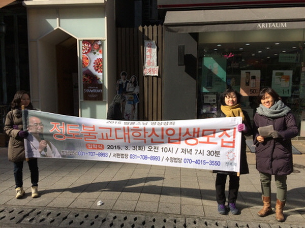 마지막으로 불교대학에 더 많은 분들이 들어와서 행복해지면 좋겠다고 입을 모으며 효과적으로 알리는 방법에 대한 이야기도 나누었습니다. 역시 가장 최근에 입학한 분들이라 불교대학을 처음 접하는 외부의 시각을 들을 수 있었습니다. 정토회나 불교대학은 조금 어렵게 느껴진다, 많은 사람들이 즉문즉설을 통해서 쉽게 선택한다, 법당에서는 나름대로 홍보에 힘쓰고 있다고 생각하겠지만 인연이 닿지 못하는 사람들을 위해서 홍보를 훨씬 더 많이 하면 좋겠다, 절실한 마음이 있고 인연이 닿으면 어떻게든 오게 되는 것 같다는 이야기에 모두 공감을 하였습니다. 그리고 마지막으로 자기가 사는 아파트 단지에 홍보하는 방법을 나누면서 함께 홍보를 열심히 하자는 다짐으로 인터뷰를 마무리하였습니다.