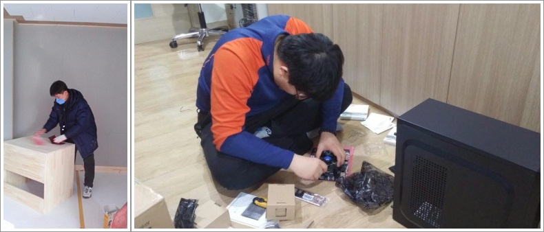 ▲ 사포질하는 조찬상 거사님 & 컴퓨터 부품 조립하고 있는 김형섭 법우님