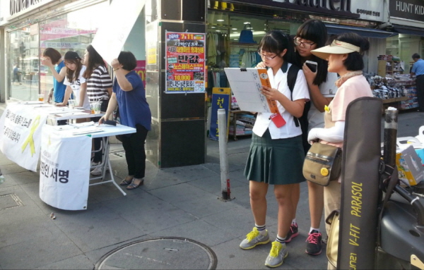 ▲ 안성의 중심거리에서 세월호 서명 받는 민숙기 보살님. 맨 오른쪽~~