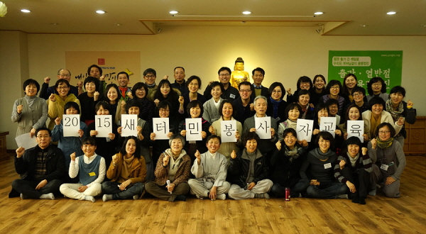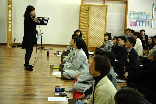 교육은 행정처 통일팀장인 이숙영 보살님이 해주었는데요, ‘새터민 정착 지원활동을 왜 해야 하는가?’라는 주제로 강의를 시작했습니다. 그런데 보살님이 시작부터 대뜸 자신이 ‘신끼’가 있는 엄청난 ‘인기 스타 강사’라고 마구마구 분위기를 띄우는 바람에 다들 졸 틈을 놓쳤네요. 아침 일찍부터 먼 길을 거쳐서 모여든 수십 명의 참가자들 중 몇 명은, 눈은 감은 채 ‘맞습니다.’하면서 고개만 끄덕거리는 사람이 있을 법도 하건만, 단 한 명도 조는 사람이 없었을 정도로 강의는 대단히 열정적이었습니다.